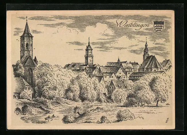 Künstler-AK Waiblingen, Ortsansicht mit Fluss, Wappen