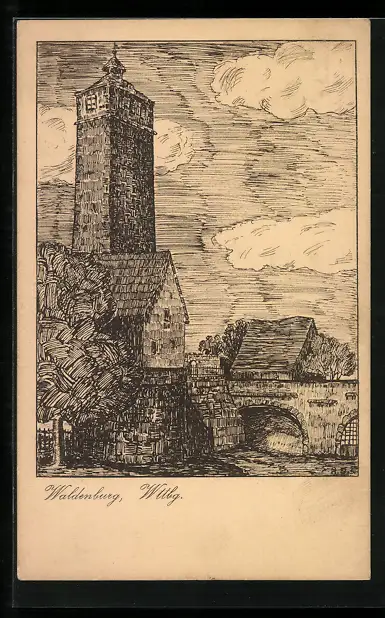 Künstler-AK Waldenburg /Wttbg., Ortsansicht mit Turm