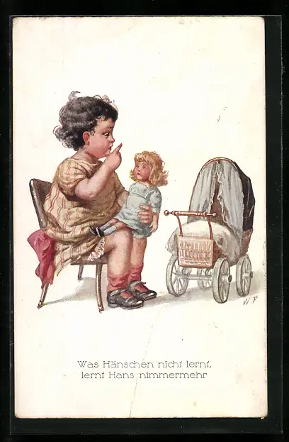 Künstler-AK Wally Fialkowska: Kleines Mädchen schimpft mit ihrer Puppe