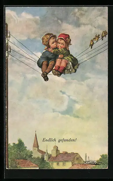 Künstler-AK Wally Fialkowska: zwei Kinder auf Drähten über dem Ort sitzend