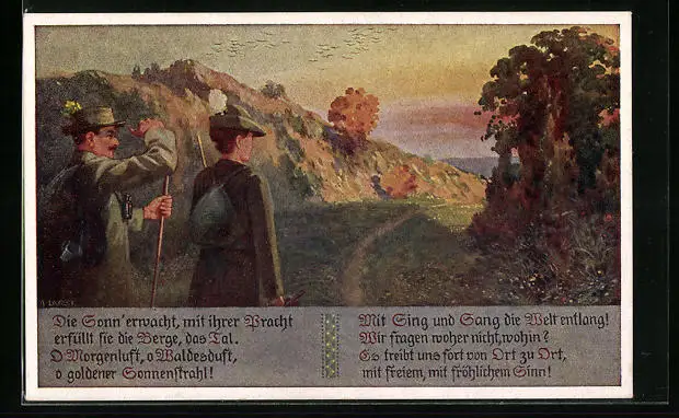 Künstler-AK Wanderer am Wegesrand in Abenstimmung
