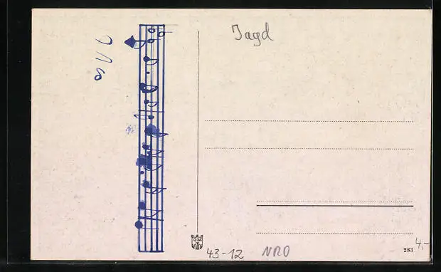 Personenbezogene Daten auf der Rückseite der Karte wurden durch blauen Textmarker unkenntlich gemacht. Die blauen Stellen sind auf die Vorderseite durchgeweicht und wirken sich negativ auf das Postkartenfoto aus