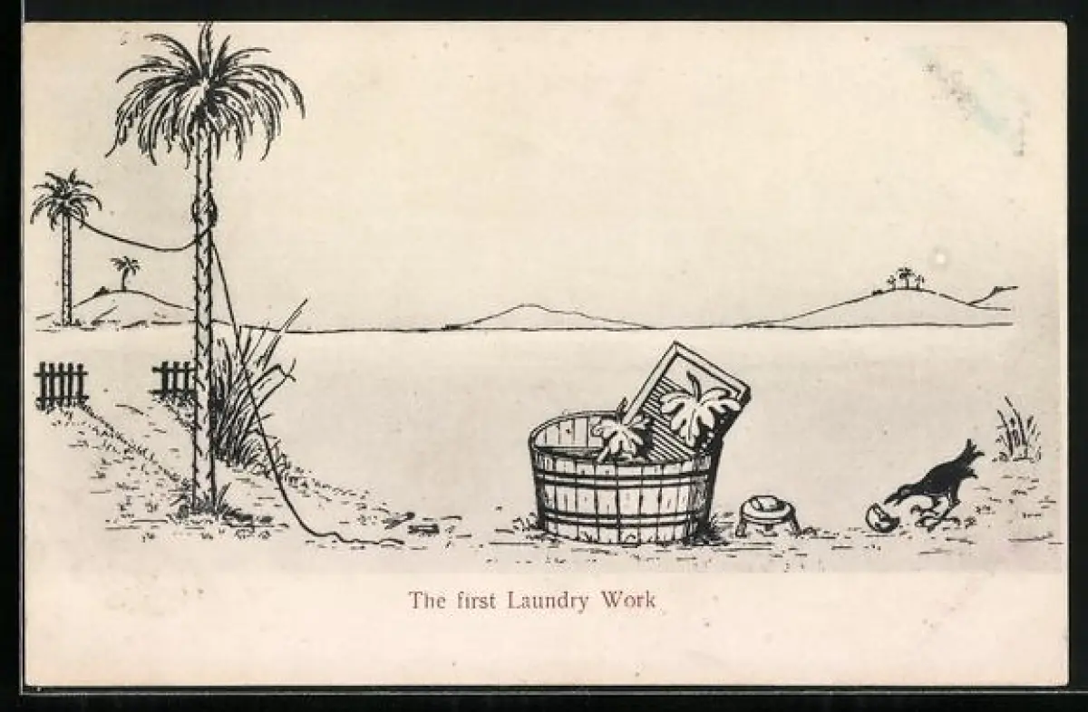 Künstler-AK Waschzuber mit Waschbrett mit Blättern, The first Laundry Work