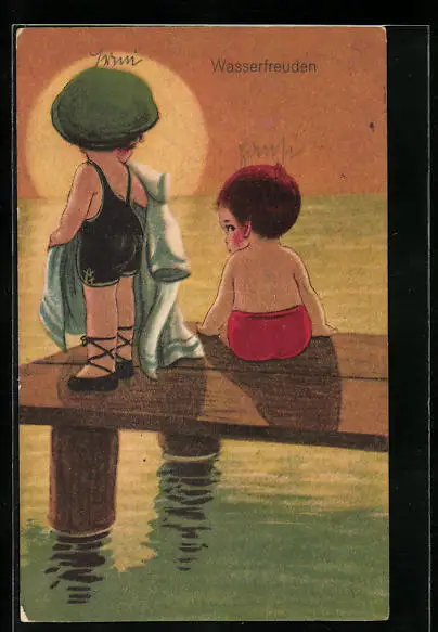 Künstler-AK Wassefreuden, Kinder in Bademode