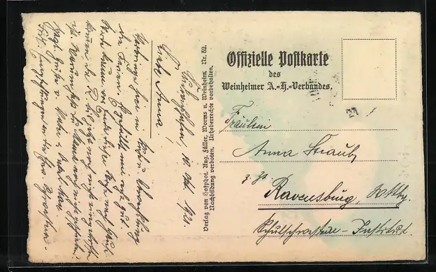 Personenbezogene Daten auf der Rückseite der Karte wurden durch blauen Textmarker unkenntlich gemacht. Die blauen Stellen sind auf die Vorderseite durchgeweicht und wirken sich negativ auf das Postkartenfoto aus