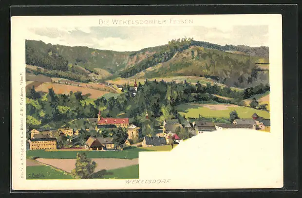 Künstler-AK Wekelsdorf, Gesamtansicht mit Wekelsdorfer Felsen