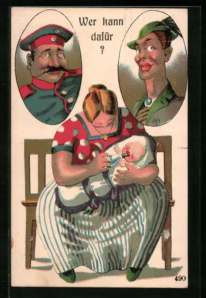 Künstler-AK Wer kann dafür?, Mutter fragt sich wer ist der Vater, Soldatenhumor