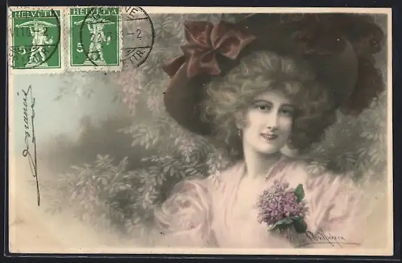 Künstler-AK Wichera: Frau mit Hut und Blumen