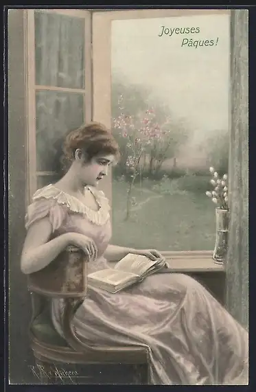 Künstler-AK Wichera: Junge Frau liest am Fenster, Ostergruss