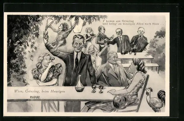 Künstler-AK Wien, In Grinzing beim Heurigen