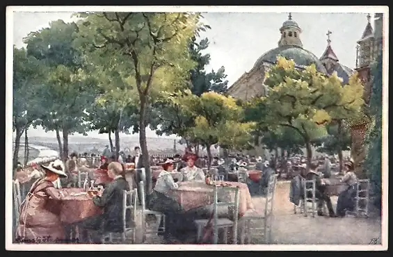 Künstler-AK Wien-Leopoldsberg, Partie im Restaurant von Karl Hofbauer