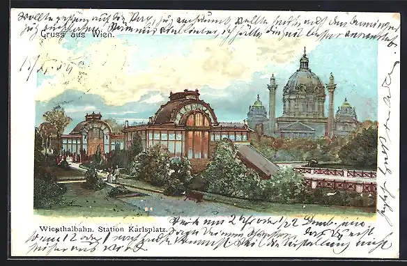 Künstler-AK Wien, Wiesthalbahn, Station Karlsplatz mit Anlagen und Karlskirche