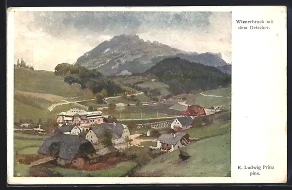 Künstler-AK Wienerbruck, Ortsansicht mit dem Ötscher