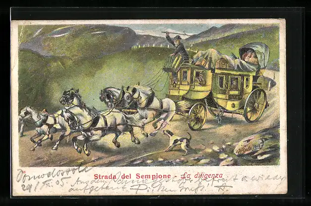 Künstler-AK Wilde Fahrt mit der Gotthardpost, Postkutsche