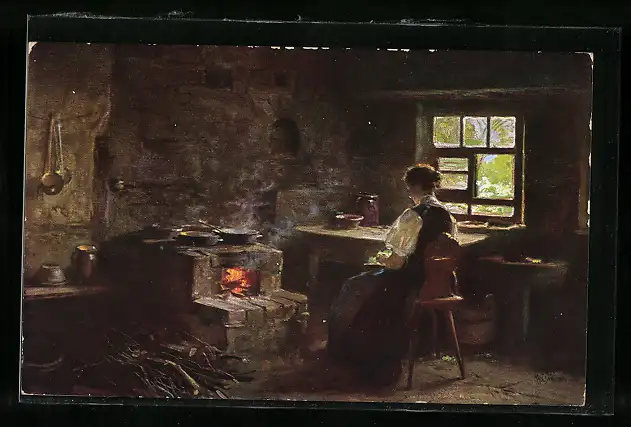 Künstler-AK Wilhelm Hasemann: Frau in einer Schwarzwälder Küche