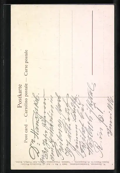 Personenbezogene Daten auf der Rückseite der Karte wurden durch blauen Textmarker unkenntlich gemacht. Die blauen Stellen sind auf die Vorderseite durchgeweicht und wirken sich negativ auf das Postkartenfoto aus