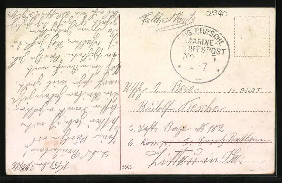 Personenbezogene Daten auf der Rückseite der Karte wurden durch blauen Textmarker unkenntlich gemacht. Die blauen Stellen sind auf die Vorderseite durchgeweicht und wirken sich negativ auf das Postkartenfoto aus