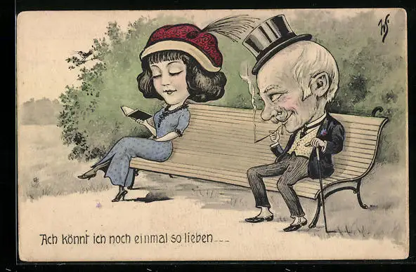 Künstler-AK Willi Scheuermann: Alter Herr beobachtet junge Dame auf einer Bank