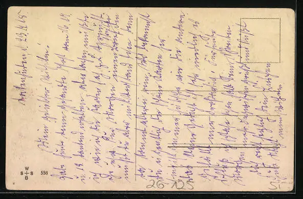 Personenbezogene Daten auf der Rückseite der Karte wurden durch blauen Textmarker unkenntlich gemacht. Die blauen Stellen sind auf die Vorderseite durchgeweicht und wirken sich negativ auf das Postkartenfoto aus