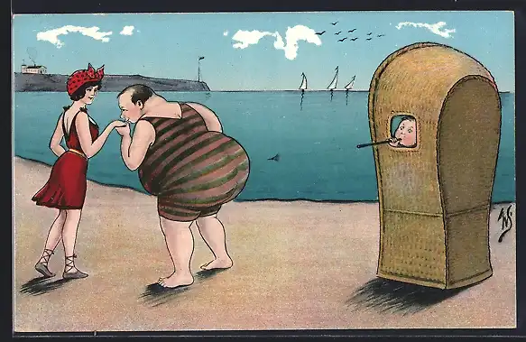 Künstler-AK Willi Scheuermann: Dicker Kavalier am Strand wird von Knabe mit Pusterohr beschossen