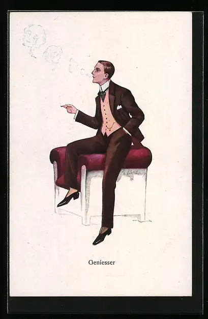 Künstler-AK Willi Scheuermann: Eleganter Kavalier mit Zigarette bläst Rauchringe in Frauengestalt