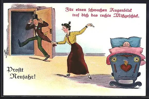 Künstler-AK Willi Scheuermann: Frau zerrt Mann zum Baby in der Wiege, Neujahrsgruss