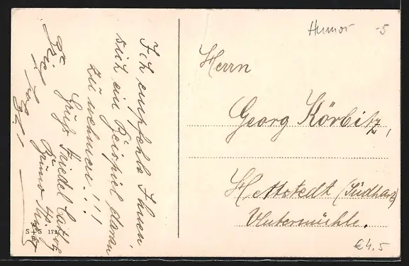 Personenbezogene Daten auf der Rückseite der Karte wurden durch blauen Textmarker unkenntlich gemacht. Die blauen Stellen sind auf die Vorderseite durchgeweicht und wirken sich negativ auf das Postkartenfoto aus