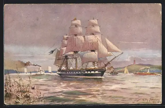 Künstler-AK Willy Stoewer: Dreimast-Segelschiff in Ufernähe