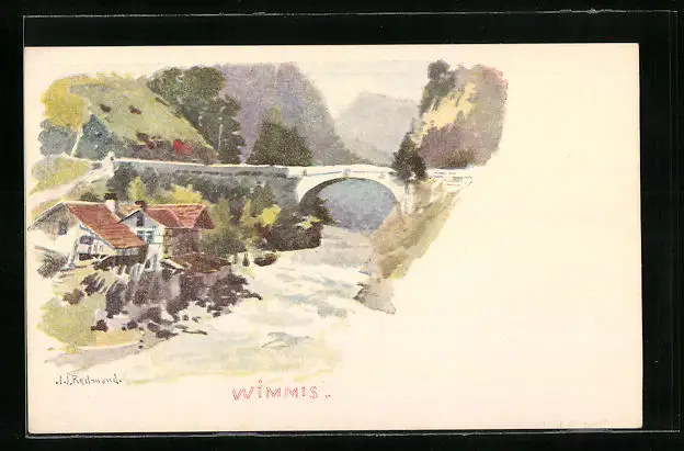 Künstler-AK Wimmis, Uferpartie mit Brücke