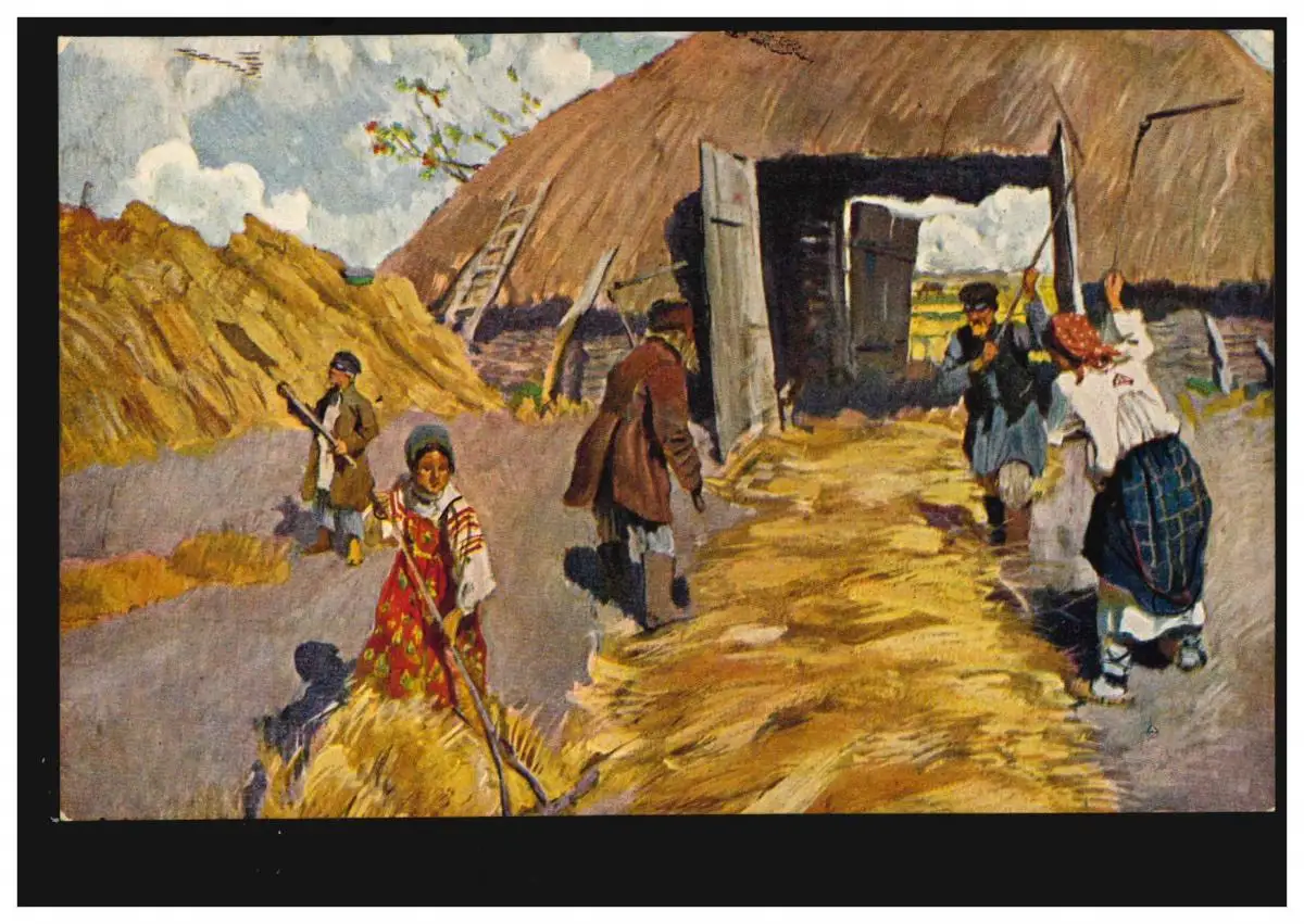 Künstler-AK Winogradoff: Auf der Tenne - Beim Getreidedreschen, ungebraucht