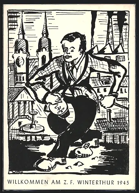 Künstler-AK Winterthur, Riesenhafter Mann tanzt in der Stadt