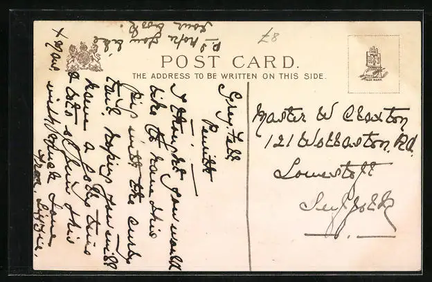 Personenbezogene Daten auf der Rückseite der Karte wurden durch blauen Textmarker unkenntlich gemacht. Die blauen Stellen sind auf die Vorderseite durchgeweicht und wirken sich negativ auf das Postkartenfoto aus