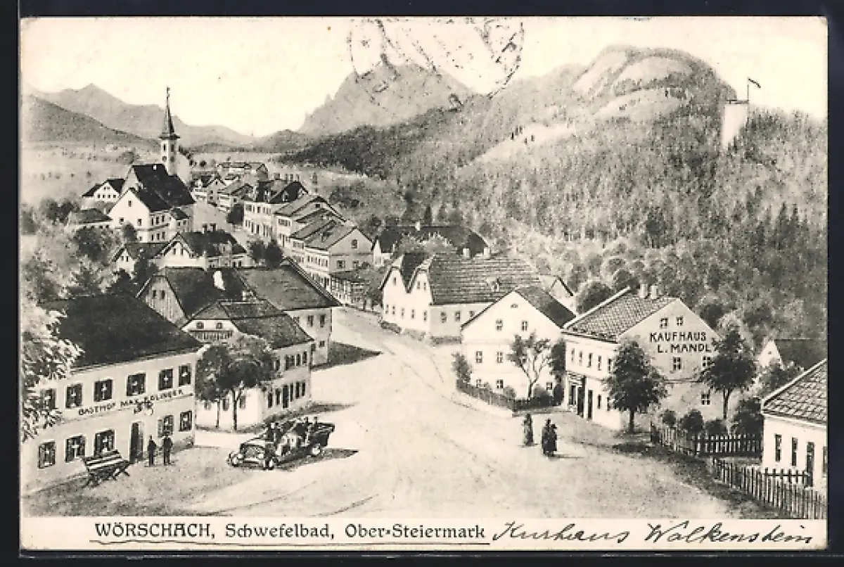 Künstler-AK Wörschach, Ortspartie mit Gasthof Max Polinger & Kaufhaus L. Mandl