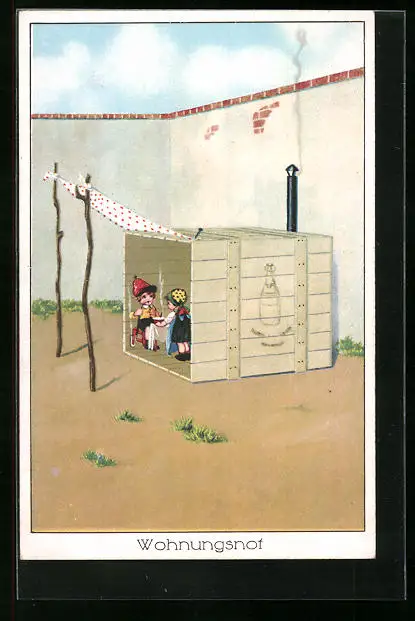 Künstler-AK Wohnungsnot, Kleines Paar wohnt in einer Holzkiste