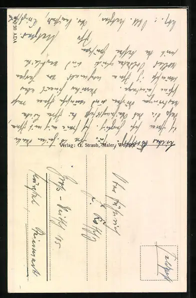 Personenbezogene Daten auf der Rückseite der Karte wurden durch blauen Textmarker unkenntlich gemacht. Die blauen Stellen sind auf die Vorderseite durchgeweicht und wirken sich negativ auf das Postkartenfoto aus