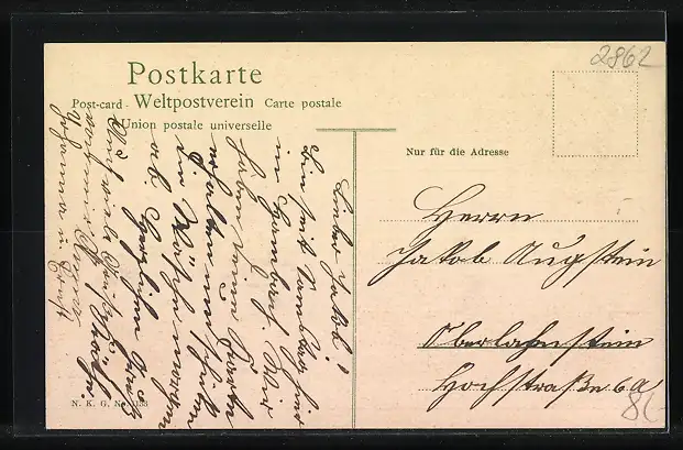 Personenbezogene Daten auf der Rückseite der Karte wurden durch blauen Textmarker unkenntlich gemacht. Die blauen Stellen sind auf die Vorderseite durchgeweicht und wirken sich negativ auf das Postkartenfoto aus