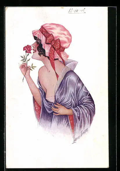 Künstler-AK Xavier Sager: Frau im Morgenmantel riecht an einer Rose