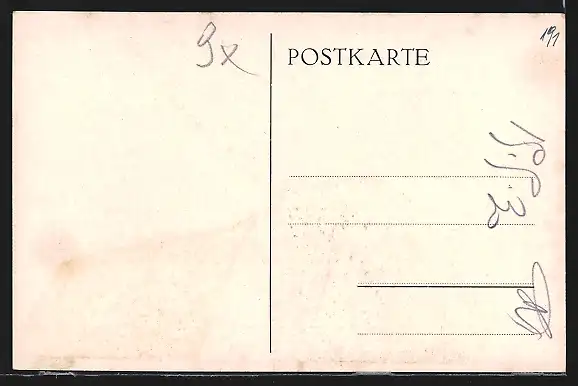 Personenbezogene Daten auf der Rückseite der Karte wurden durch blauen Textmarker unkenntlich gemacht. Die blauen Stellen sind auf die Vorderseite durchgeweicht und wirken sich negativ auf das Postkartenfoto aus