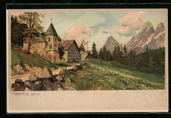 Künstler-AK Zeno Diemer: Fernpass, Gasthaus auf der Passhöhe