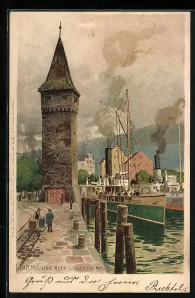 Künstler-AK Zeno Diemer: Lindau / Bodensee, Der alte Leuchtturm, Dampfer