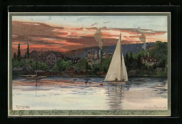 Künstler-AK Zeno Diemer: Tutzing, Uferpartie mit Segelboot
