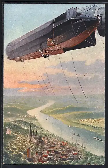 Künstler-AK Zeppelin Luftschiff über einer Stadt schwebend