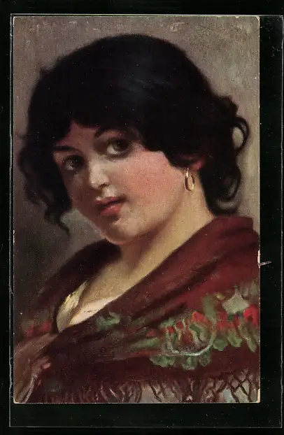 Künstler-AK Zigeunerin, schwarzhaariges Mädchen mit Ohrring