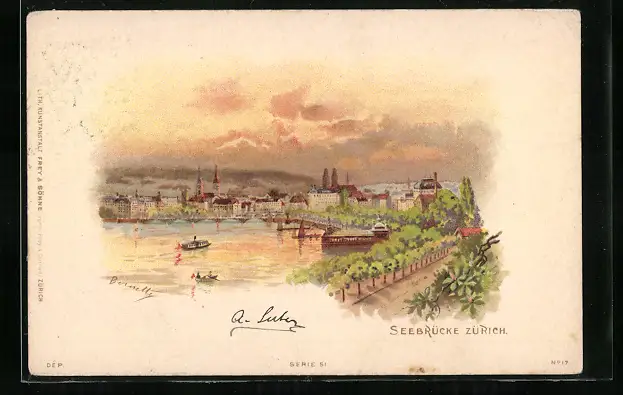 Künstler-AK Zürich, Seebrücke im Abendrot