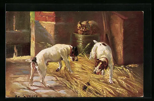 Künstler-AK Zwei Hunde bei der Mäusejagd im Stall