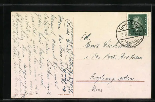 Personenbezogene Daten auf der Rückseite der Karte wurden durch blauen Textmarker unkenntlich gemacht. Die blauen Stellen sind auf die Vorderseite durchgeweicht und wirken sich negativ auf das Postkartenfoto aus