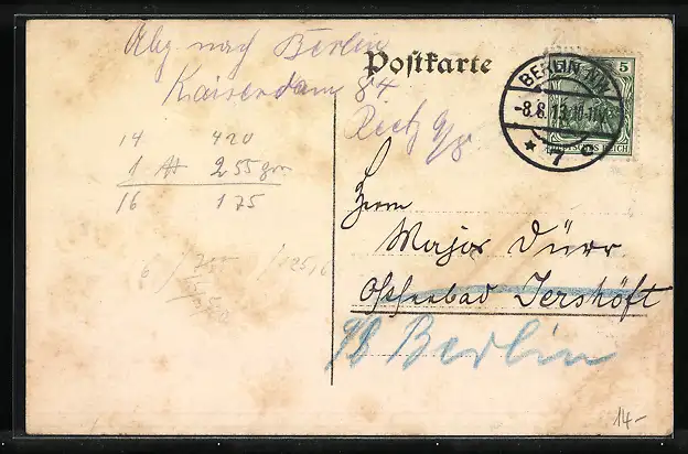 Personenbezogene Daten auf der Rückseite der Karte wurden durch blauen Textmarker unkenntlich gemacht. Die blauen Stellen sind auf die Vorderseite durchgeweicht und wirken sich negativ auf das Postkartenfoto aus