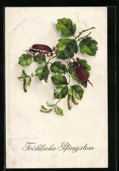 Künstler-AK Zwei Maikäfer krabbeln auf einem Birkenzweig, Pfingstgruss