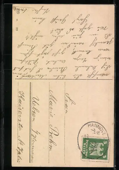 Personenbezogene Daten auf der Rückseite der Karte wurden durch blauen Textmarker unkenntlich gemacht. Die blauen Stellen sind auf die Vorderseite durchgeweicht und wirken sich negativ auf das Postkartenfoto aus