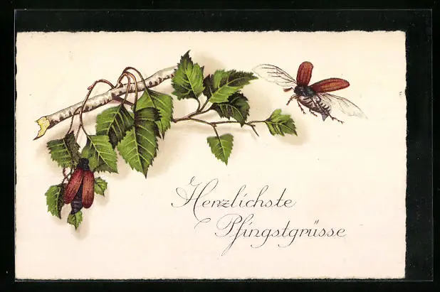 Künstler-AK Zwei Maikäfer mit einem Birkenast - Pfingstgruss